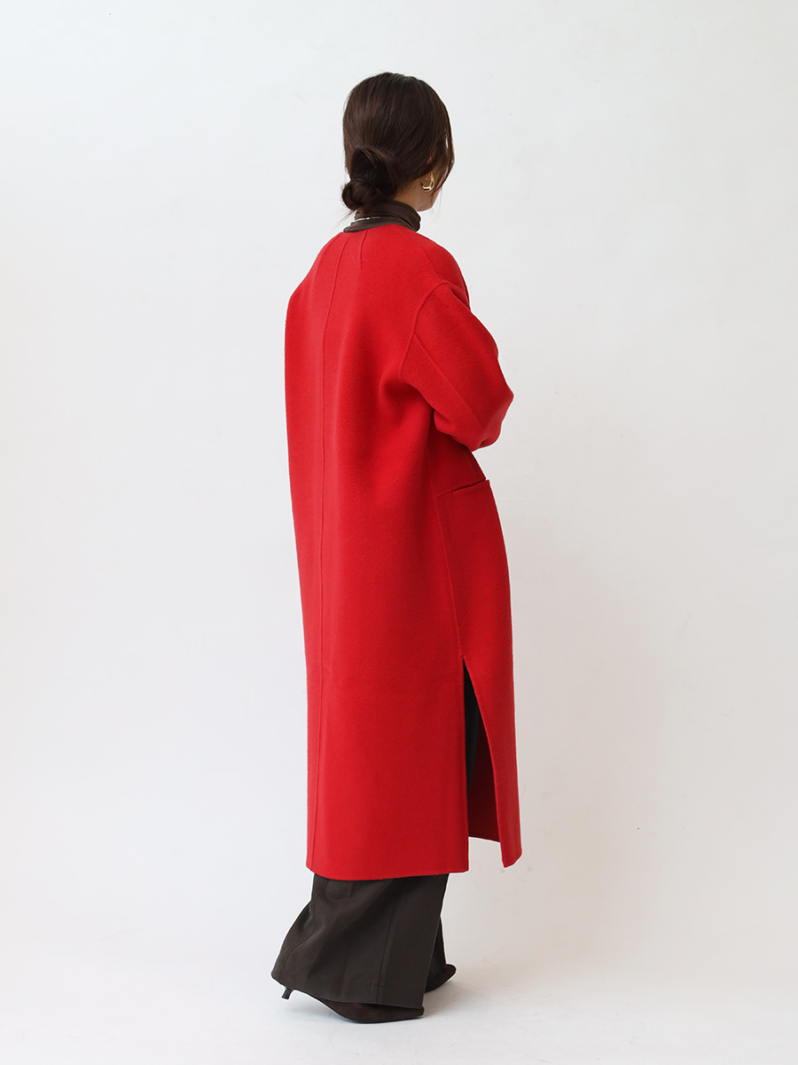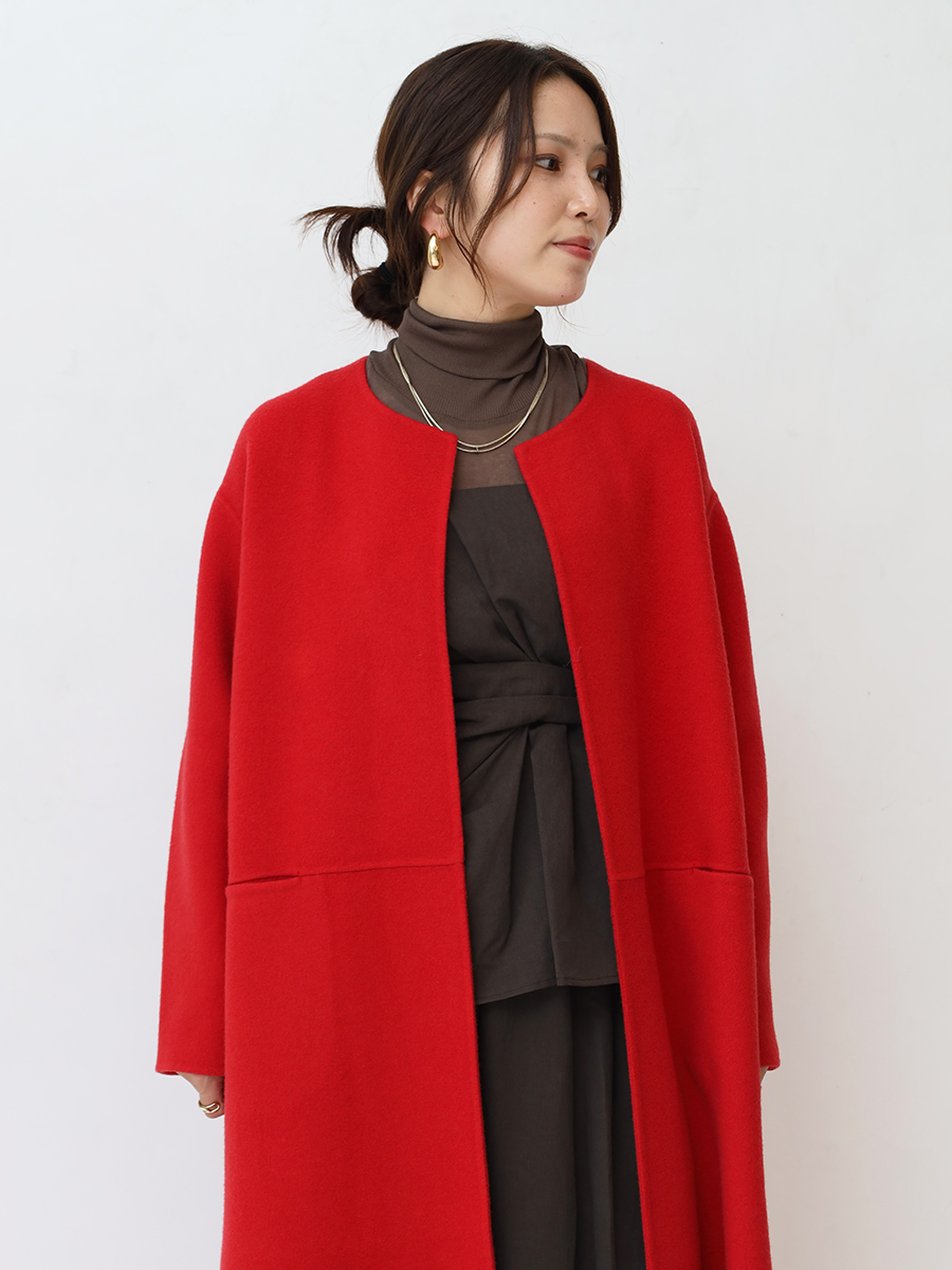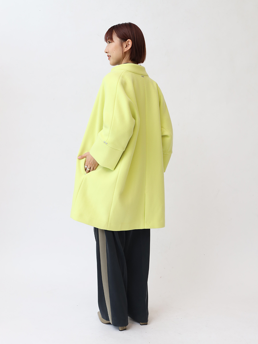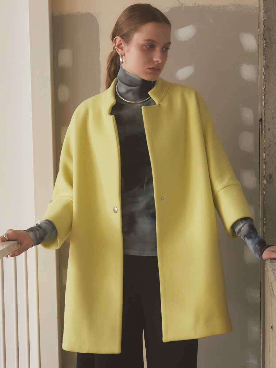 鮮やかな発色が目を惹くノーカラーコート。