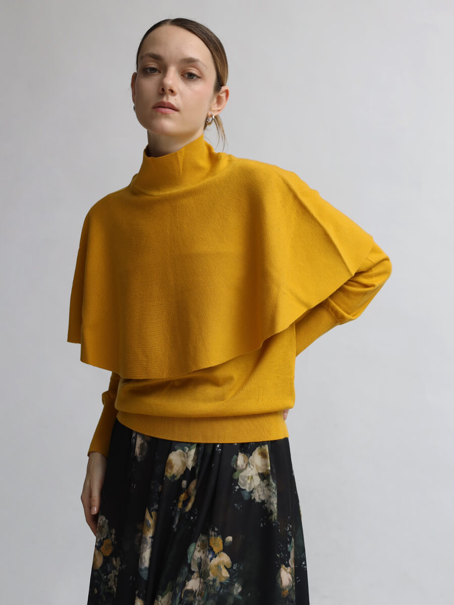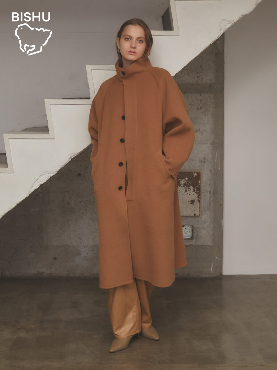 スタンドカラーが顔周りをモードに仕立てながらも、