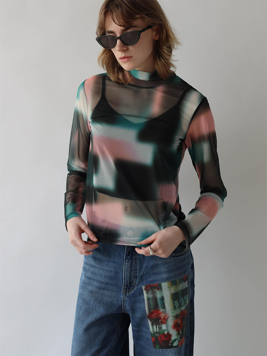 GEOMETRIC PRINT SHEER TULLE TOPS