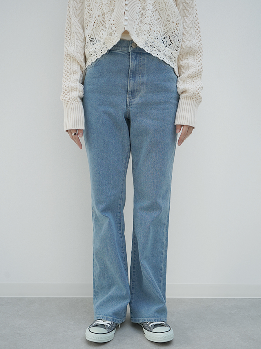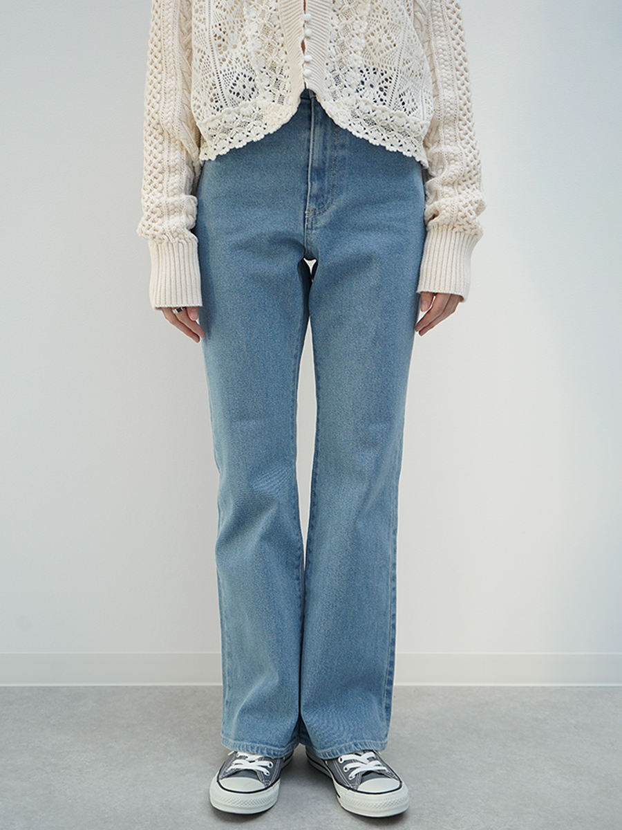 ナチュラルなフレア感とすっきりとしたスリムデザインが特徴のデニムパンツ。 程よくストレッチの効く素材で着心地も抜群です。 ポケットの位置を高めに設定することで、きれいなヒップラインに。 ハイウエスト仕様で腰の位置を高く見せ、スタイルアップを叶えます。 1本は持っておきたい、オールシーズン活躍する定番デニムです。