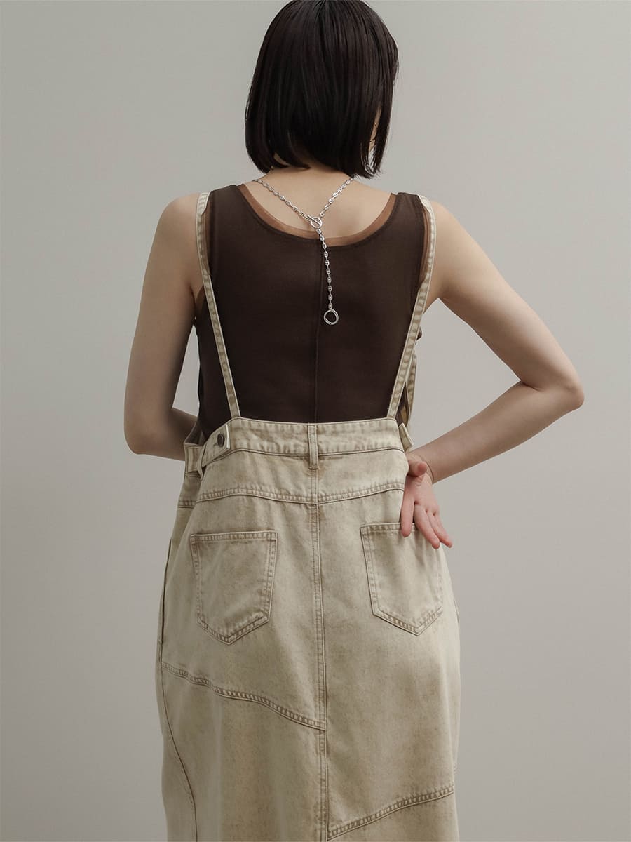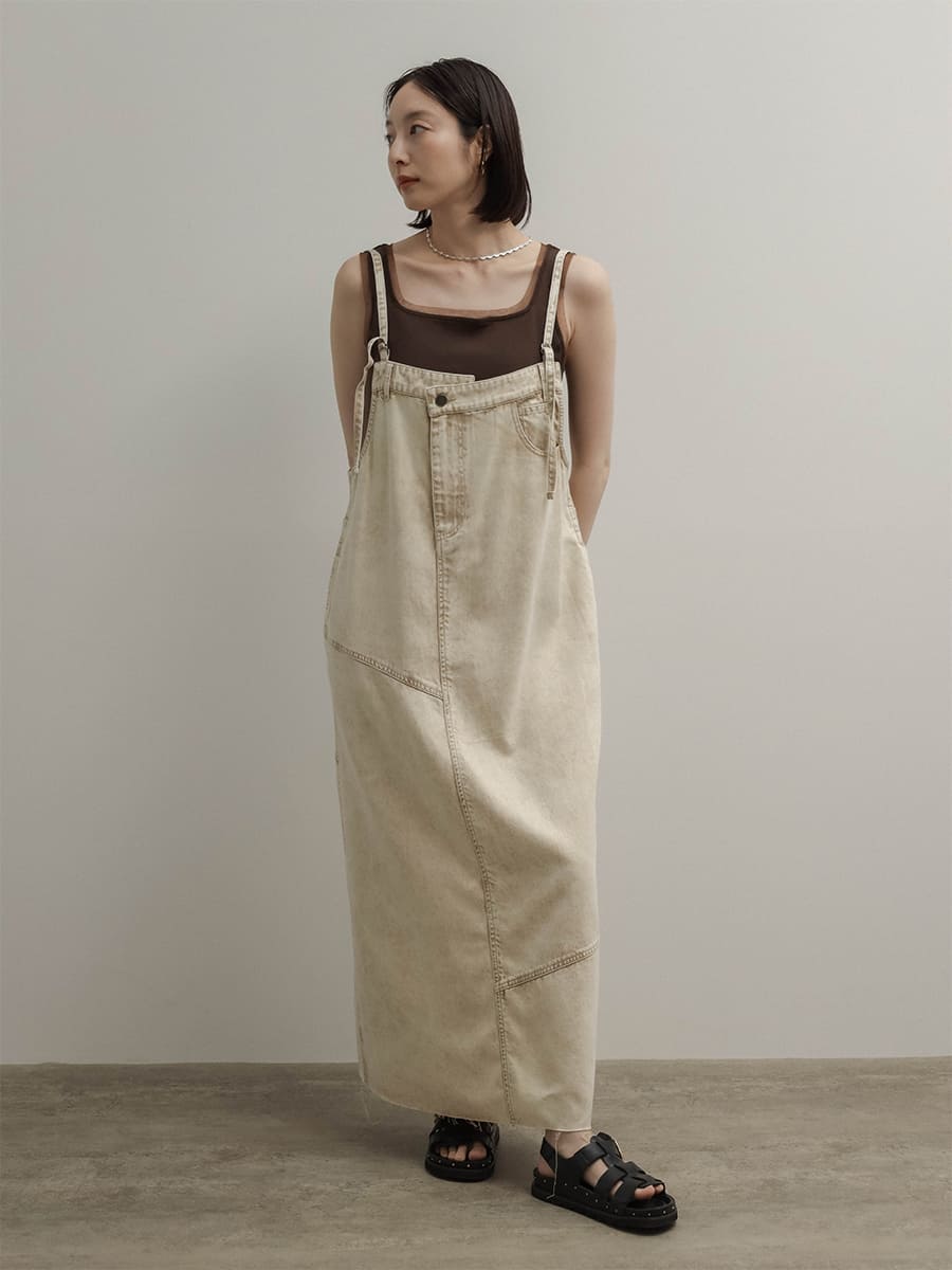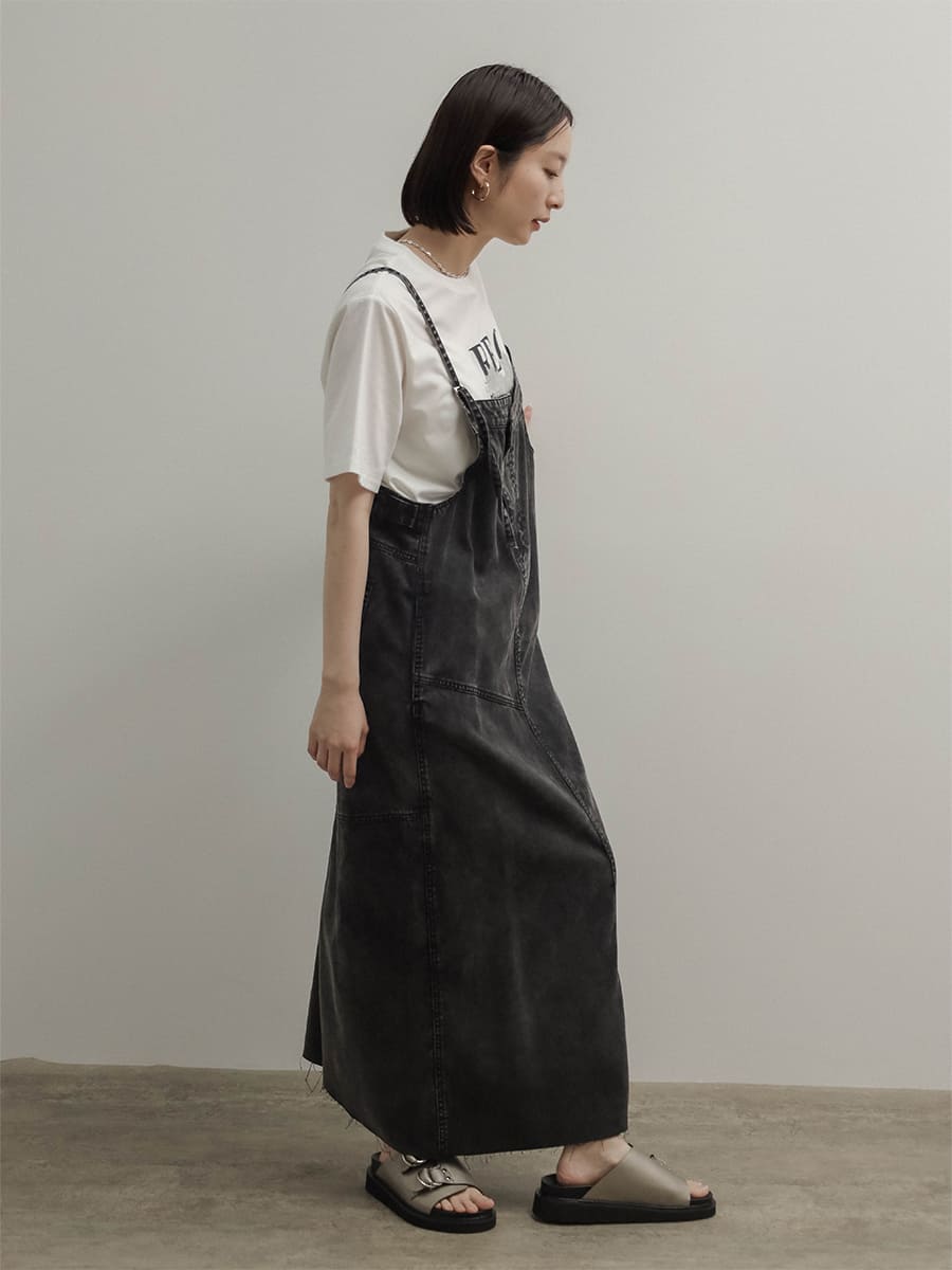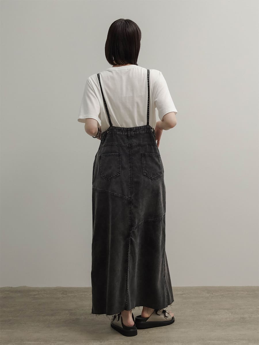 ウエスト両サイドにはボタンを施し、肩紐は調整可能な仕様で、自分に合ったバランスで着用いただけます。深めのバックスリットが抜け感をプラスし、カジュアルになりすぎない印象に。どんなインナーとも合わせやすく、オールシーズン活躍する主役級の一枚です。