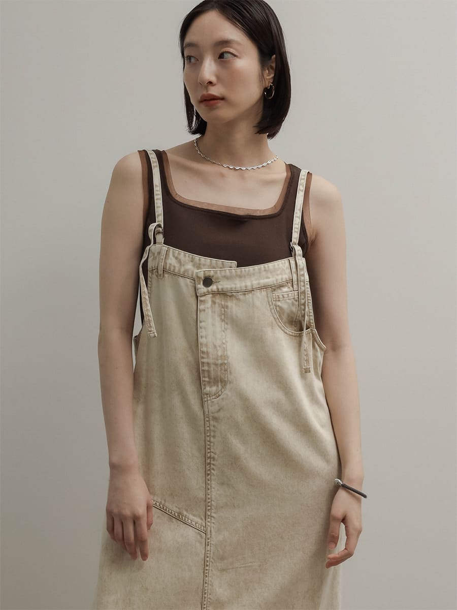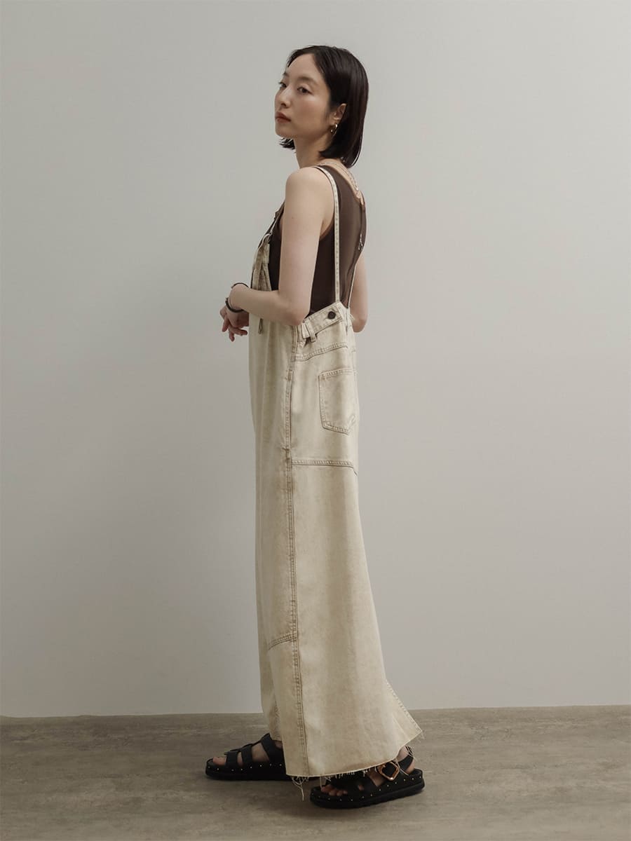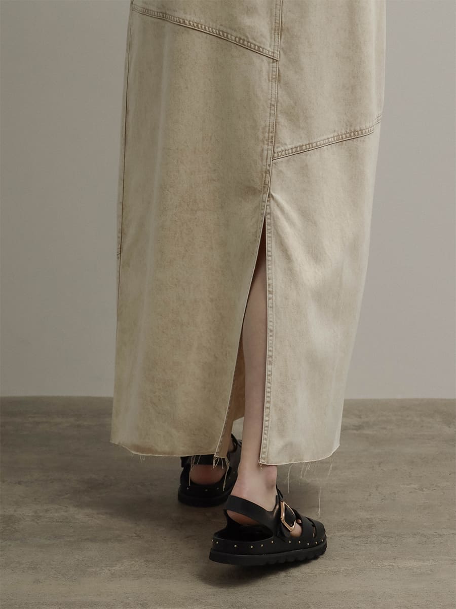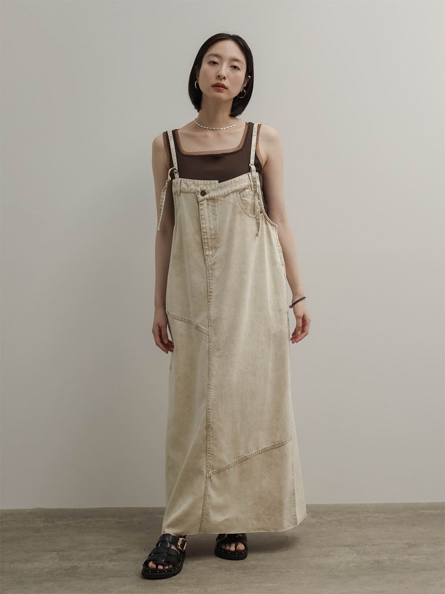 ウエスト両サイドにはボタンを施し、肩紐は調整可能な仕様で、自分に合ったバランスで着用いただけます。深めのバックスリットが抜け感をプラスし、カジュアルになりすぎない印象に。どんなインナーとも合わせやすく、オールシーズン活躍する主役級の一枚です。
