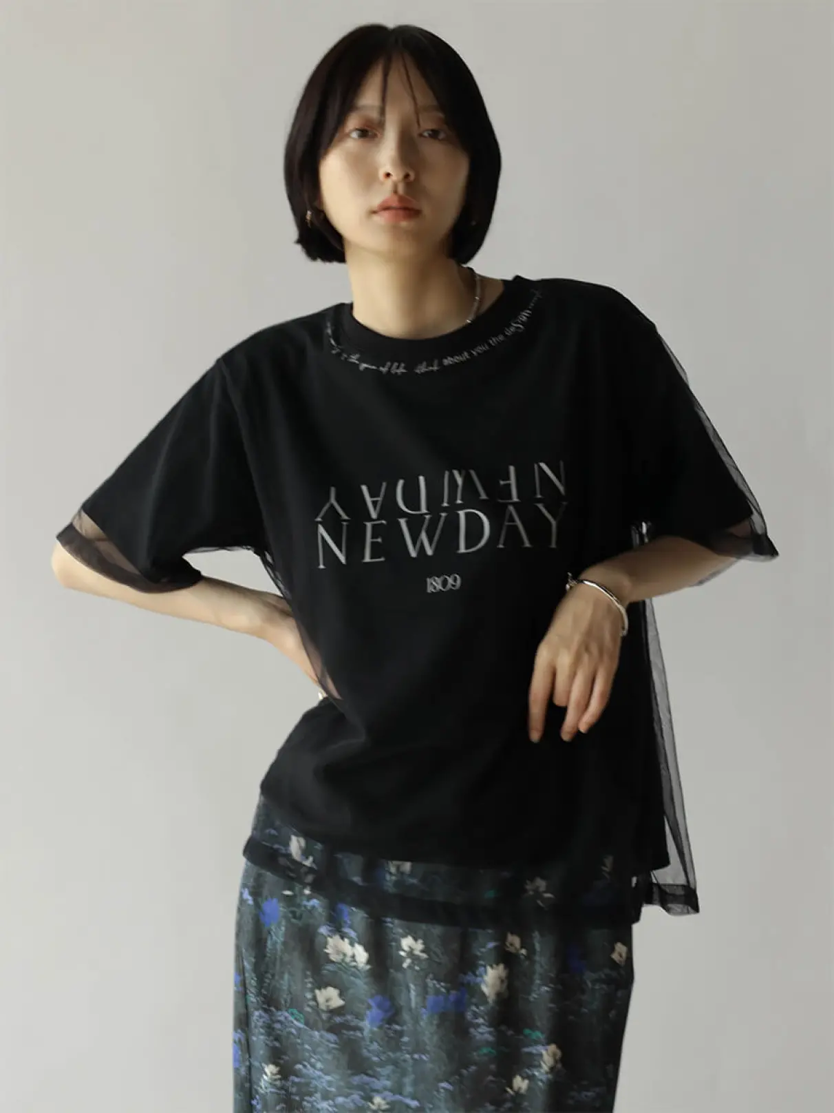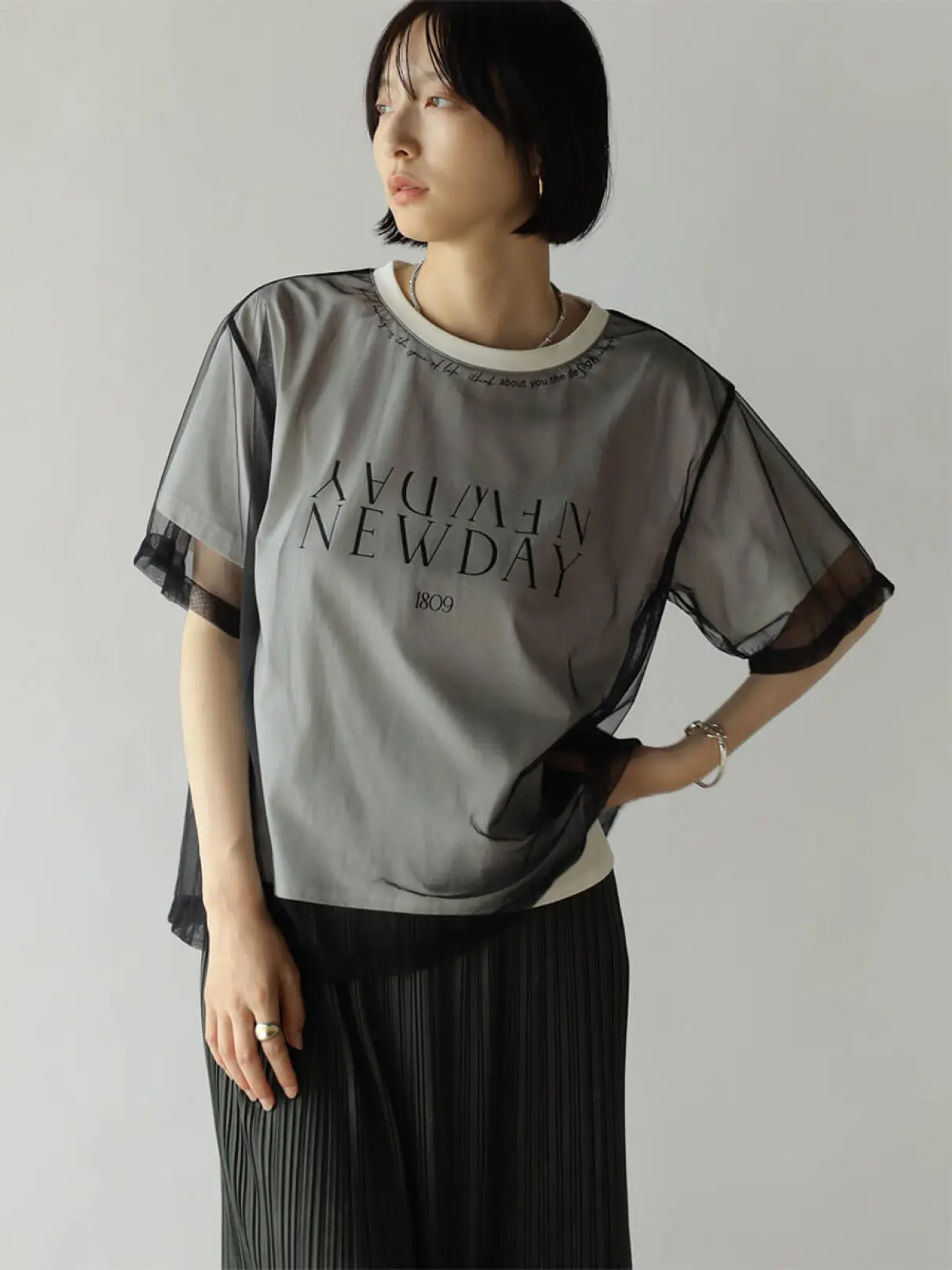 フロントロゴをチュールで重ねた印象的なTシャツ。コットンポリエステルのシルキーで適度な張りと柔らかさを兼ね揃えた高級なこだわり素材を贅沢にチュールでレイヤード。首元のロゴも顔周りを華やかにみせてくれます。インナーをウエストインし、チュールを外に出しての着用がおすすめです。ナイロンチュールのほど良い張り感とシアー感がこなれ感ある仕上がりに。