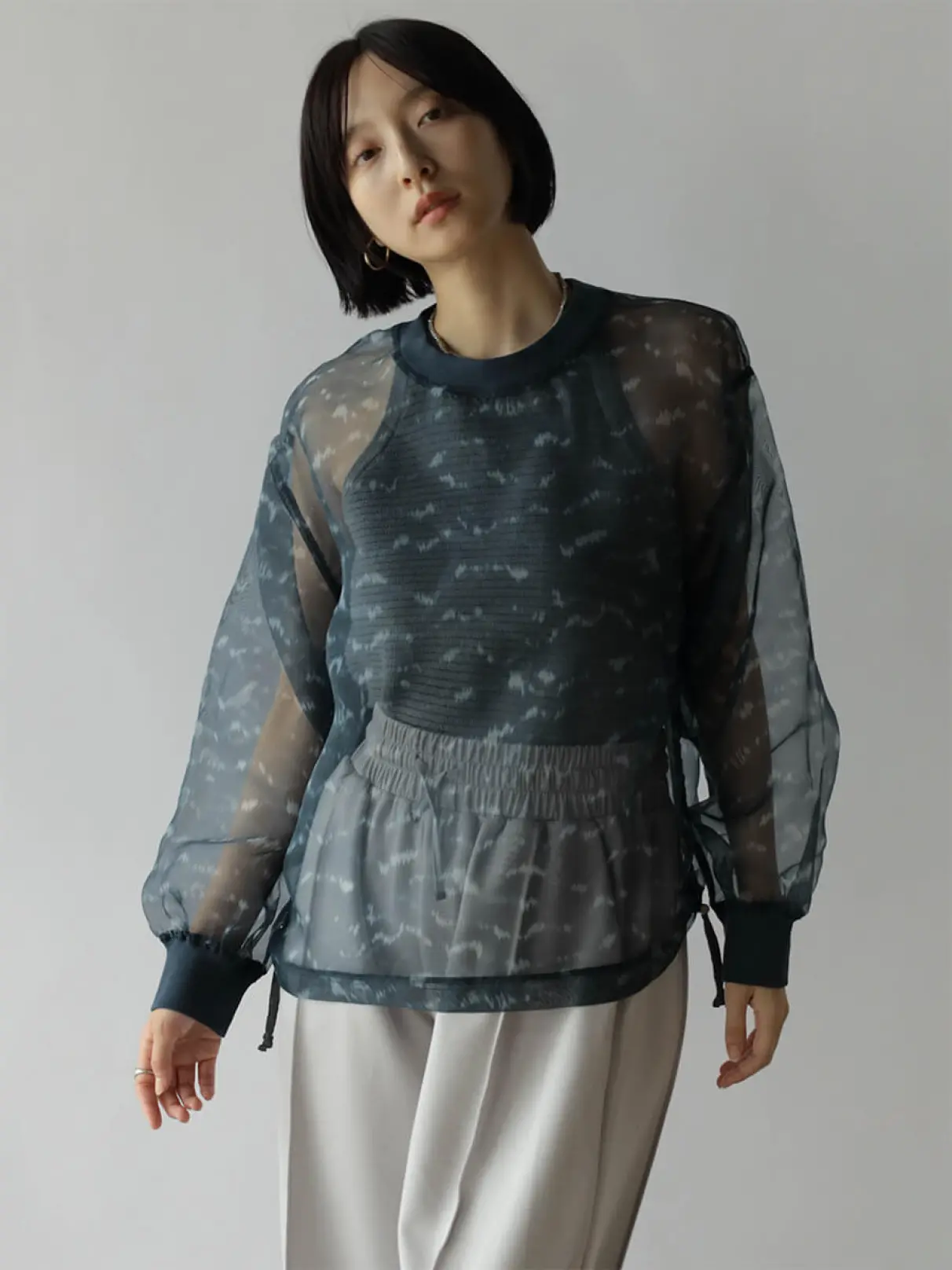 柔らかな色合いのタイダイ柄が爽やかな印象を与えるシアーブラウス。透け感のある生地を使用しており、シーズンらしい軽やかな着こなしが叶います。ゆったりとしたシルエットでリラックス感を漂わせ、大人なスタイリングに。裾にはドロスト付きなので、お好みのシルエットで着用していただけます。タンクトップやキャミソールとの合わせはもちろん、Tシャツやキャミワンピースにレイヤードするコーディネートもおすすめです。