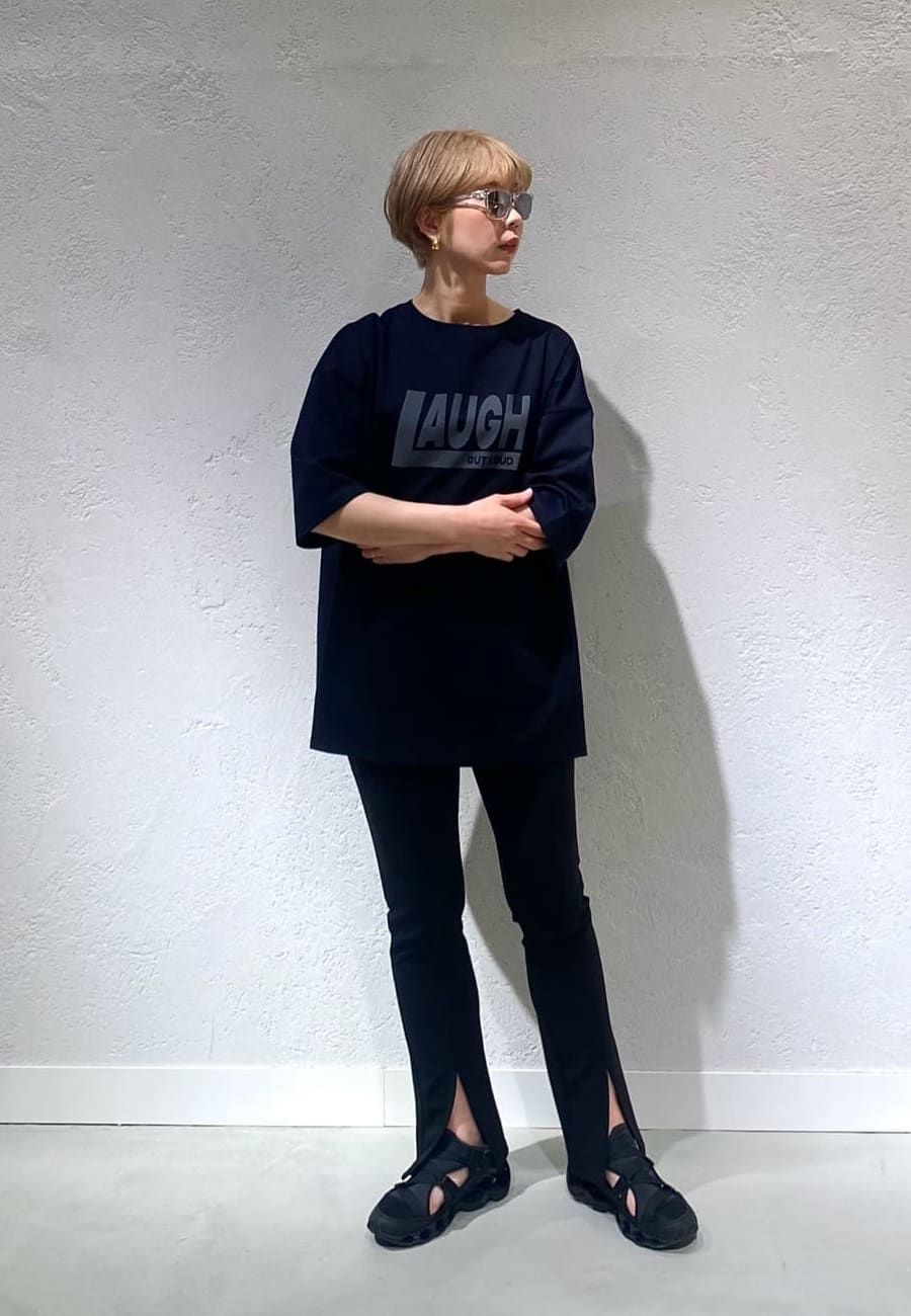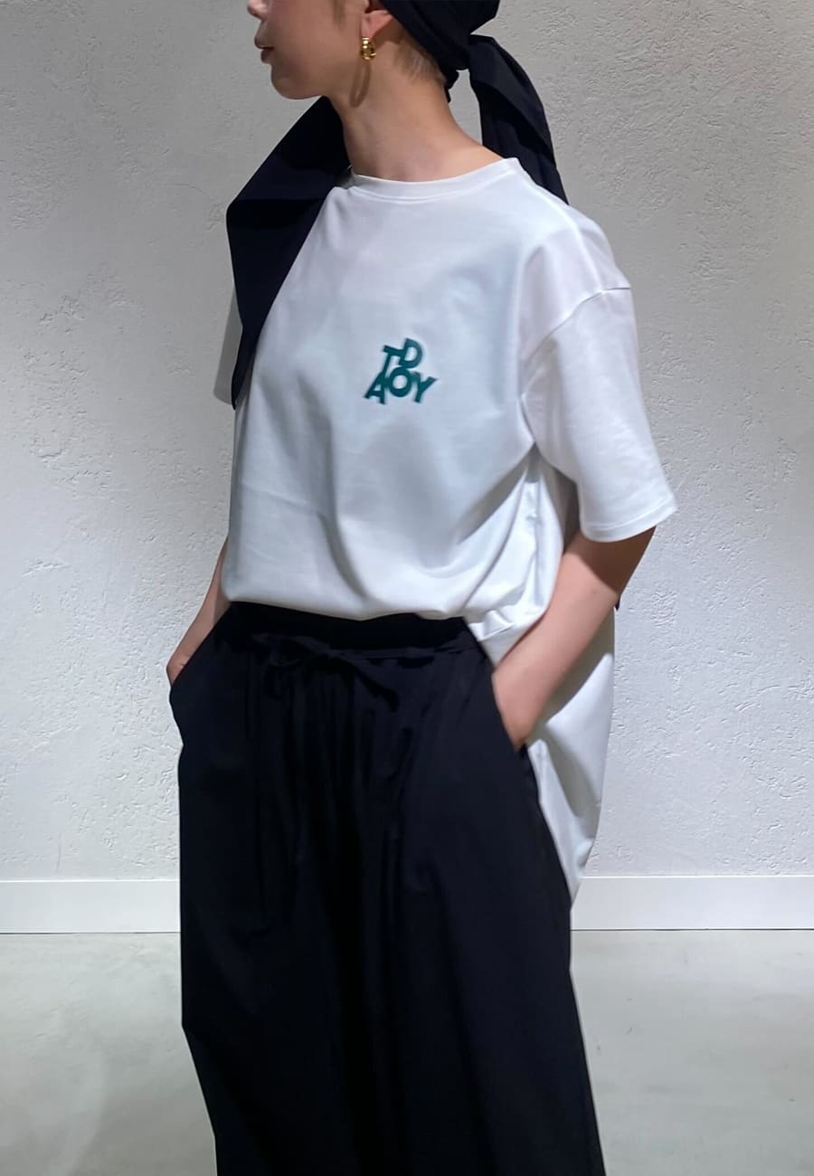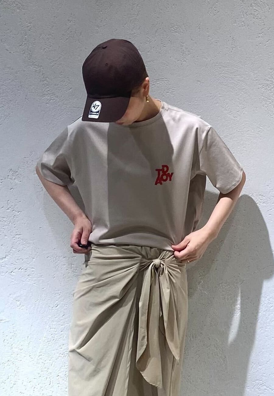 オーバーサイズに、大きめなロゴなので 暑い季節に一枚で着てサマになるこちらの Tシャツは、 大人が取り入れやすいよう ボディとプリントのコントラストがつきすぎないような配色を意識しました。 そうすることでメンズライクになりすぎず 様々なスタイリングに 取り入れていただけるかと思っています。 着丈、袖丈と体型カバーにもぴったりで サイドスリット入りなのも ボトム選びを楽しめるポイントです。