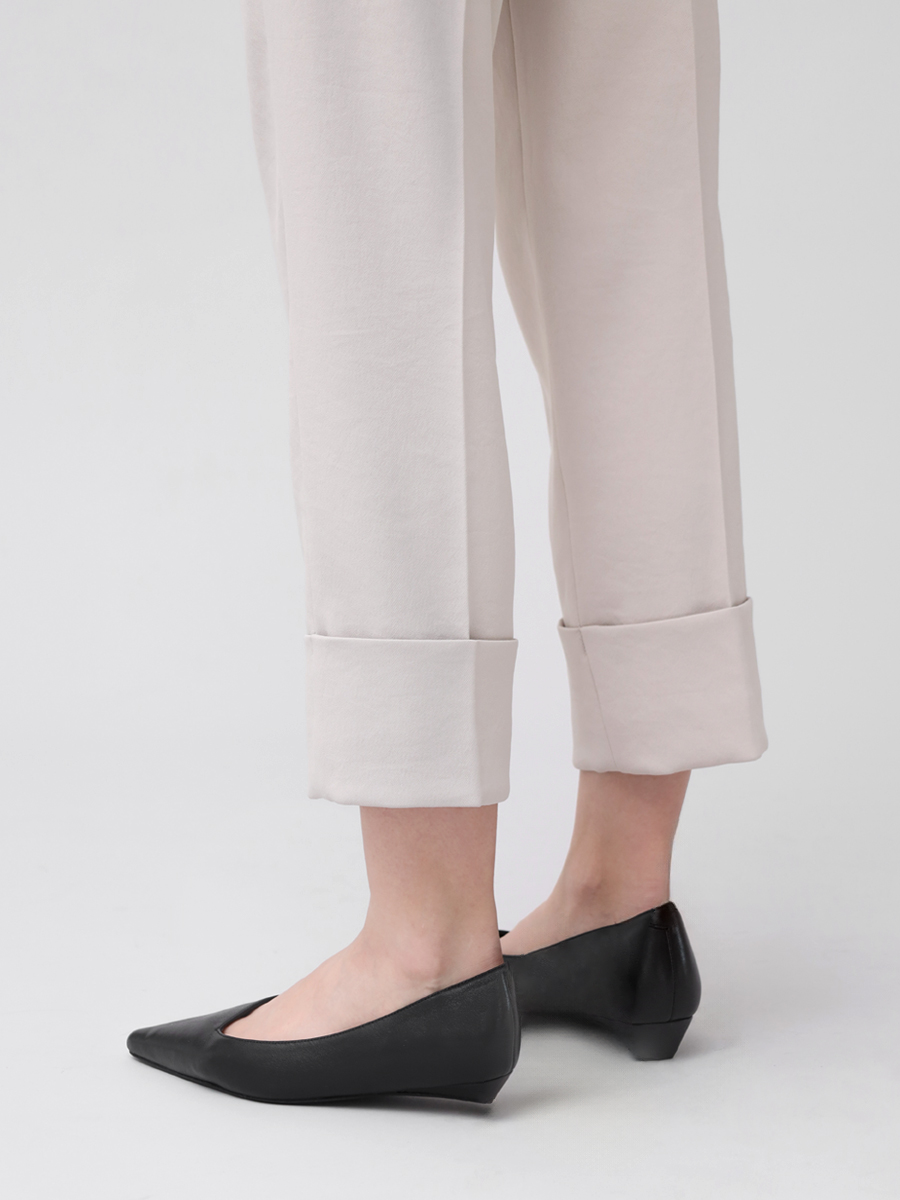 裾はロールアップデザインになっており、スタイリングにこなれ感をプラスしてくれるのが嬉しいポイント。 また、裾のもたつきを解消し、足首を見せることで、脚長効果抜群に。スッキリとスタイリッシュな印象を与えます。