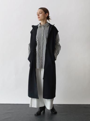 トップスもボトムスもコンパクトめなのでロングジレを羽織って体型カバー👏