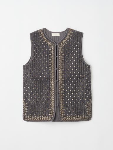 ゴールド刺繍が映えて可愛いベロアキルティングベストを合わせて