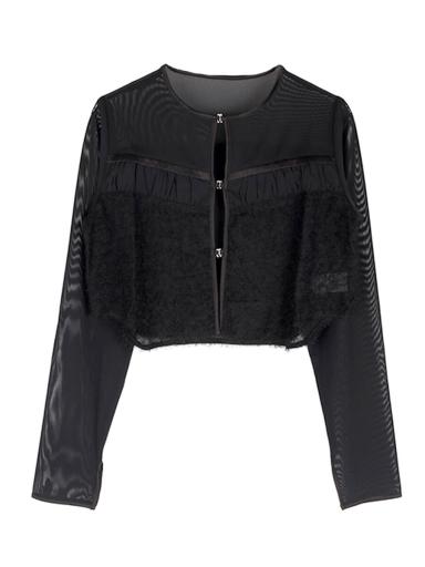 シャギー素材がドッキングされたボレロを合わせてセットアップ風に。