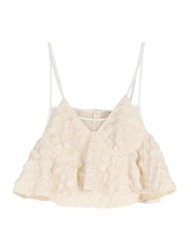 甘さのあるフリルビスチェは、ミリタリーテイストのパンツと合わせることで、程よくカジュアルダウン